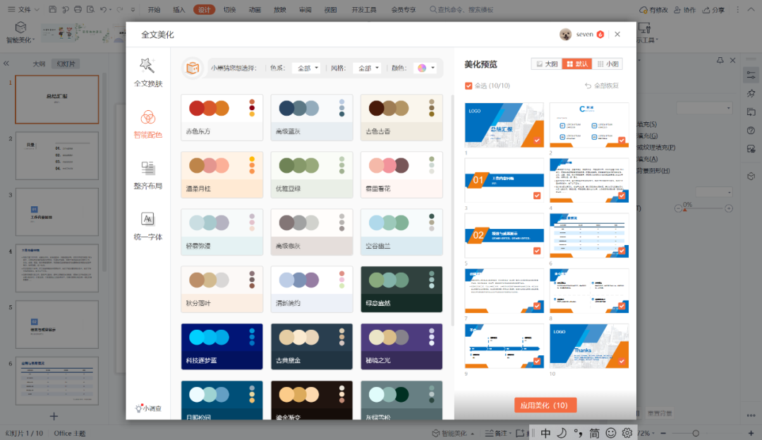 在遇到换肤后模板颜色不够满意的情况下,还可以使用【智能配色】给整份PPT换个颜色,丰富的专业配色方案,让幻灯片更有高级感!